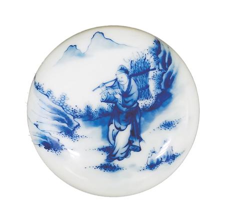 一件是青花印泥盒,制作于20世紀(jì)初。直徑7厘米,高3厘米,盒身扁圓,鼓腹,上下相合。盒蓋用青花繪“樵夫讀書”圖。畫面遠(yuǎn)處,兩座山峰高聳云間,四周樹木蔥蘢,山石嶙峋。畫面正中的山路上,一樵夫砍柴歸來,身背一大捆柴草,他右手扶著木棍,左手則捧著一本書,雙眼盯著書本,緊抿嘴唇,正津津有味地邊走邊讀。讀到精彩處,露出會心一笑。看來,這個樵夫是極愛讀書的,這種好學(xué)精神,難道不值得我們學(xué)習(xí)嗎?這件瓷印泥盒,青花色澤典雅,人物衣褶神態(tài)描繪細(xì)致,栩栩如生,胎體堅致,白釉溫潤,層次清晰,保存完好。