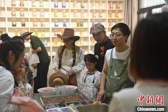 8月20日,甘肅敦煌莫高里工匠村內(nèi),研學(xué)導(dǎo)師向?qū)W員介紹敦煌礦物質(zhì)顏料。工匠村開設(shè)了泥板畫、彩繪、雕塑制作、剪紙、農(nóng)耕體驗(yàn)等課程,現(xiàn)已發(fā)展成為一個(gè)集敦煌文化講堂、壁畫書法研習(xí)、美術(shù)設(shè)計(jì)、彩塑制作教學(xué)、篆刻藝術(shù)、傳統(tǒng)釀酒體驗(yàn)、農(nóng)業(yè)產(chǎn)業(yè)發(fā)展等于一體的多功能實(shí)訓(xùn)基地。中新社記者 李亞龍 攝