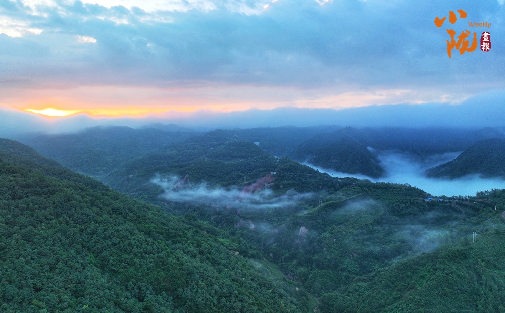 云開霧散、日照山澗,在夕陽映照下彌漫開來的云霧像涂上了一層金黃色,大地、山川顯得格外瑰麗。