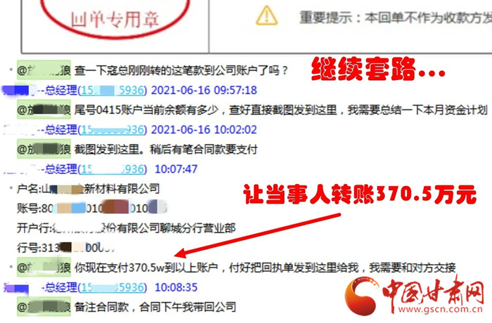 據(jù)了解,6月16日上午9時20分左右,安寧區(qū)某公司財務(wù)人員岳先生收到一封由“公司股東”發(fā)來的電子郵件,在郵件中推送了一個新建的QQ工作群,岳先生沒有多想就加入了此群。不久后,詐騙分子在此QQ群中冒充該公司法人和另外一名財務(wù)人員對岳先生下達指令,要求其向?qū)Ψ街付ㄣy行賬戶轉(zhuǎn)賬合同款370.5萬元。