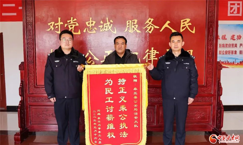中國甘肅網(wǎng)2月3日訊(本網(wǎng)記者 程?。?月2日,劉先生代表20余名工友將一面印有“持正義秉公執(zhí)法,為民工討薪維權(quán)”的鮮紅錦旗送到了蘭州市皋蘭縣公安局,以此表達(dá)對(duì)縣局治安管理大隊(duì)民警幫其辛苦討要工資的感謝。