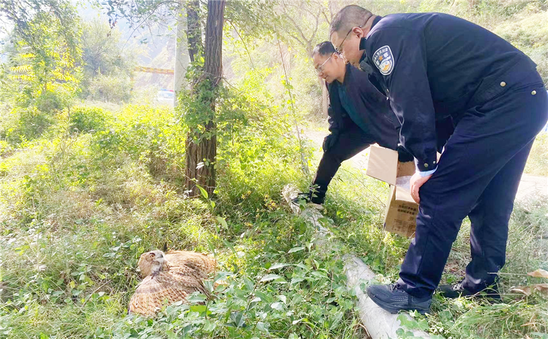 到達(dá)現(xiàn)場后,經(jīng)確認(rèn)該野生物種屬于國家二級保護動物、雕鸮(貓頭鷹)。通過現(xiàn)場檢查,該貓頭鷹身體狀況良好,無外傷,活動情況良好,具有野外生存能力,符合放生條件。于當(dāng)日,民警將其帶至野外放歸大自然。