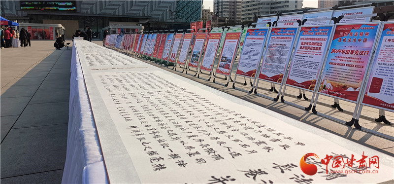 活動現(xiàn)場,省委宣傳部、省委政法委、省法院、省檢察院等20余家單位結(jié)合行業(yè)實(shí)際,宣傳憲法,普及法律知識,為群眾提供法律咨詢。為了豐富普法載體,讓群眾在互動參與中學(xué)習(xí)法律知識,活動展出了由定西市通渭縣司法局聯(lián)合書法家、師生群體、法官、檢察官、公安民警等各行各業(yè)工作人員創(chuàng)作的百米《書·法》長卷,鐫刻法治精神,書寫法律法規(guī)。現(xiàn)場還表演了精彩的文藝節(jié)目。