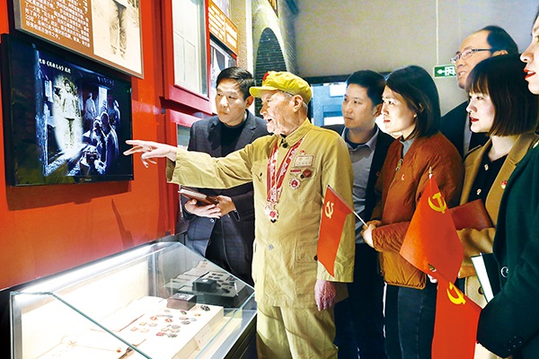 圖為江蘇省宜興市紀(jì)檢監(jiān)察干部參觀(guān)黨史陳列館,聆聽(tīng)有65年黨齡的老黨員講述抗戰(zhàn)經(jīng)歷。鄒宜賓 攝