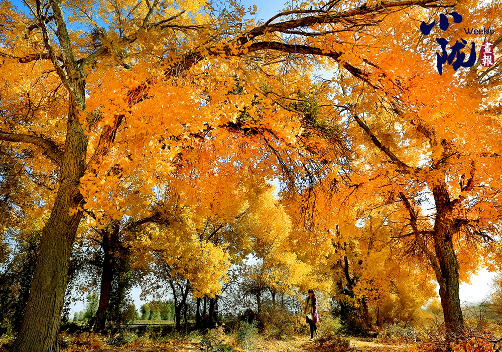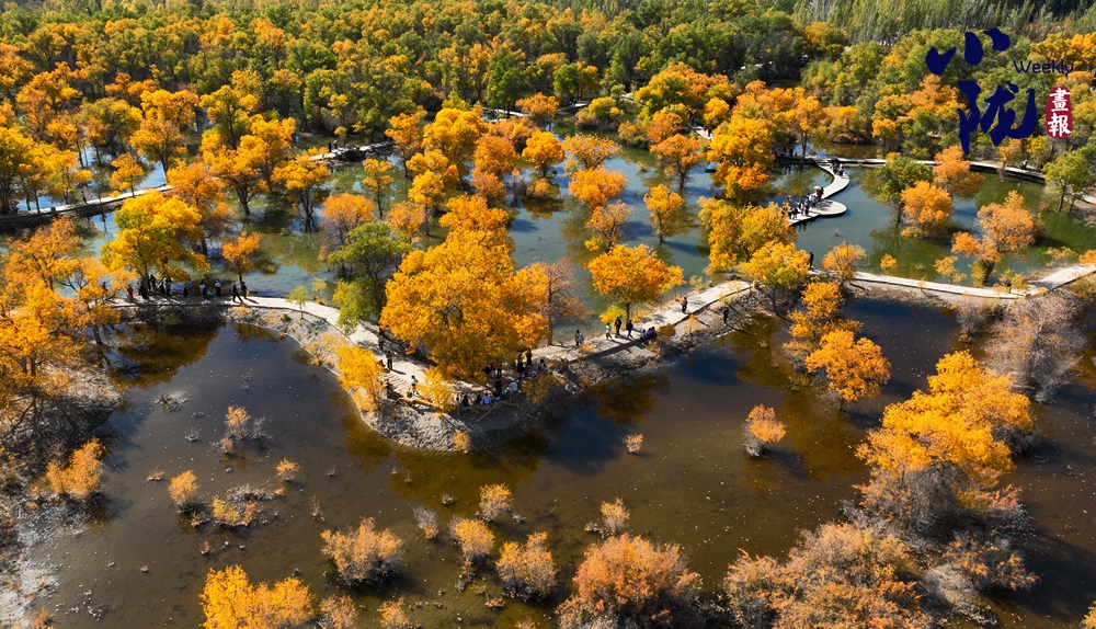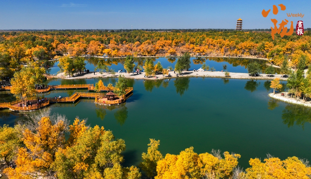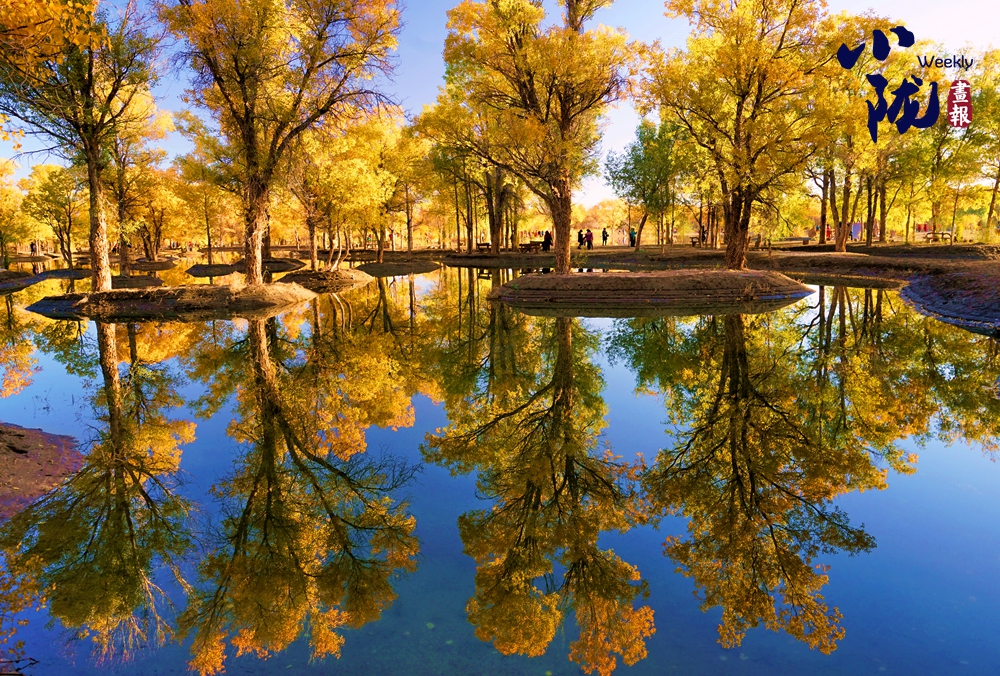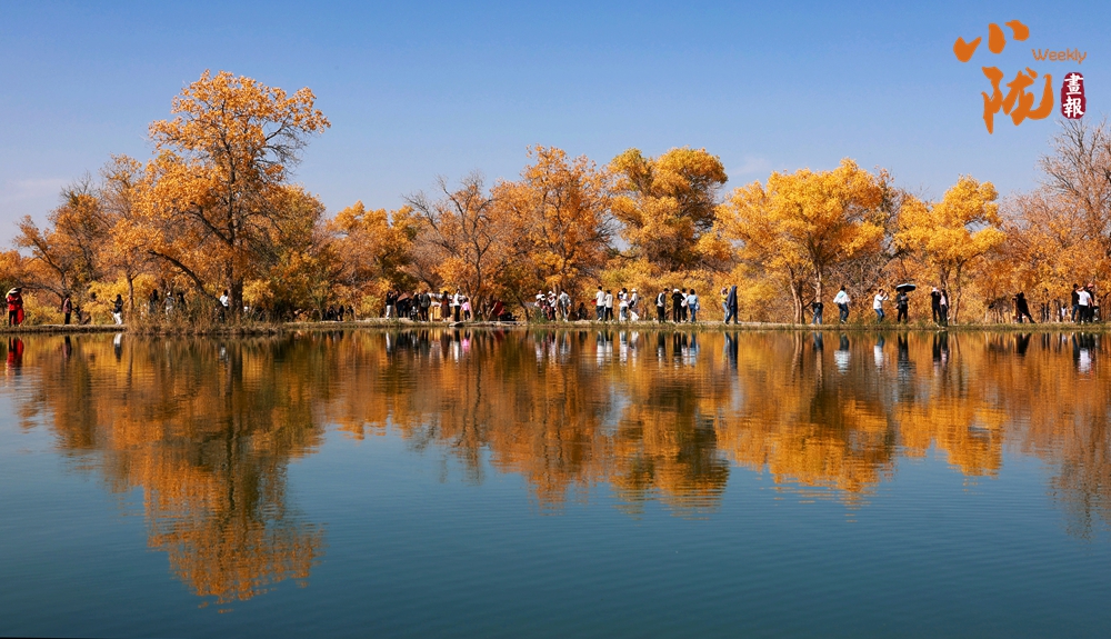 胡楊茂盛,疊翠流金,裊裊身姿倒影湖中。風(fēng)一吹,樹梢輕顫,成千上萬片葉子像被點(diǎn)燃的火焰,在藍(lán)得沒有一絲雜質(zhì)的天空下翻涌、跳躍,充滿詩意。林間小道上,游客悠閑漫步,盡享美好時光。