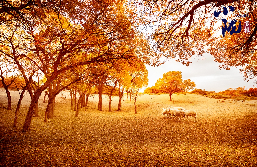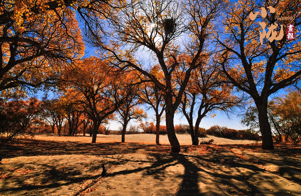 當(dāng)秋風(fēng)吹過金黃的胡楊樹葉,整片戈壁便成了被陽光熔化的鎏金海洋,輝煌而凝重。這些古老的生命已經(jīng)在這片土地上存活了數(shù)千年,它們以“生千年不死、死千年不倒、倒千年不朽”的姿態(tài)站立成永恒的風(fēng)骨。