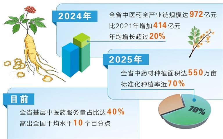 如今,全省已建立起覆蓋省、市、縣、鄉(xiāng)的中醫(yī)藥服務(wù)體系,實(shí)現(xiàn)所有綜合醫(yī)院中醫(yī)藥服務(wù)全覆蓋,基層醫(yī)療衛(wèi)生機(jī)構(gòu)中醫(yī)館全覆蓋,中醫(yī)適宜技術(shù)推廣使用全覆蓋,基層中醫(yī)藥服務(wù)量占比達(dá)40%,高出全國(guó)平均水平10個(gè)百分點(diǎn),真正做到讓人民群眾“方便看中醫(yī)、放心吃中藥”。