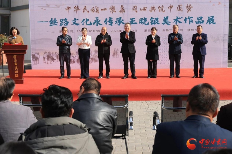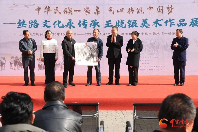 中國甘肅網(wǎng)10月31日訊 (文/趙琴 圖/柯玉棟)秋去留金彩,冬臨賞丹青。10月30日,由甘肅省文學(xué)藝術(shù)界聯(lián)合會指導(dǎo),金昌市委統(tǒng)戰(zhàn)部、甘肅省美術(shù)家協(xié)會、金昌市文化廣電和旅游局、金昌市文學(xué)藝術(shù)界聯(lián)合會主辦,金昌市美術(shù)館、金昌市美術(shù)家協(xié)會承辦,金昌市文化中心、甘肅億鎳(實業(yè))集團(tuán)有限公司、金昌市創(chuàng)新創(chuàng)業(yè)孵化服務(wù)中心協(xié)辦的“中華民族一家親 同心共筑中國夢”——絲路文化永傳承 王曉銀美術(shù)作品展在金昌市美術(shù)館開展。