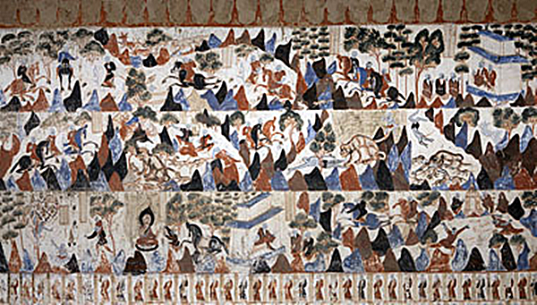 作為莫高窟北周壁畫的代表作,第428窟《薩埵太子本生》突破了傳統(tǒng)單幅畫面的局限,以三層長卷分欄鋪陳。畫師巧妙運(yùn)用群山作為情節(jié)分隔,既保持畫面獨(dú)立性,又通過蜿蜒的“S”形布局引導(dǎo)觀者視線自然流轉(zhuǎn)。