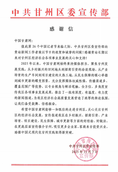 信中提到,2025年以來,中國甘肅網(wǎng)始終秉持媒體擔(dān)當(dāng),聚焦甘州發(fā)展實(shí)踐,從鄉(xiāng)村振興的田間地頭到招商引資的洽談現(xiàn)場(chǎng),從產(chǎn)業(yè)培育的生產(chǎn)車間到項(xiàng)目建設(shè)的火熱工地,從民生保障的暖心舉措到城市更新的蝶變圖景,充分發(fā)揮媒體權(quán)威性強(qiáng)、傳播渠道多、覆蓋范圍廣等優(yōu)勢(shì),以專業(yè)視角與鮮活筆觸,全方位、多角度宣傳甘州區(qū)各項(xiàng)事業(yè)發(fā)展成果,推出了一批有深度、有溫度、有力度的新聞報(bào)道。