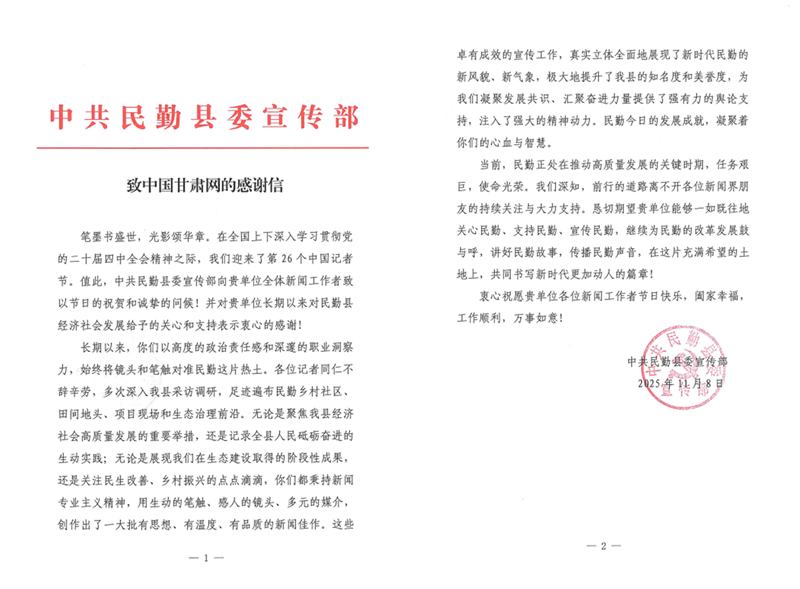 中國(guó)記者節(jié)|民勤縣委宣傳部致信感謝中國(guó)甘肅網(wǎng) 攜手記錄時(shí)代新篇章