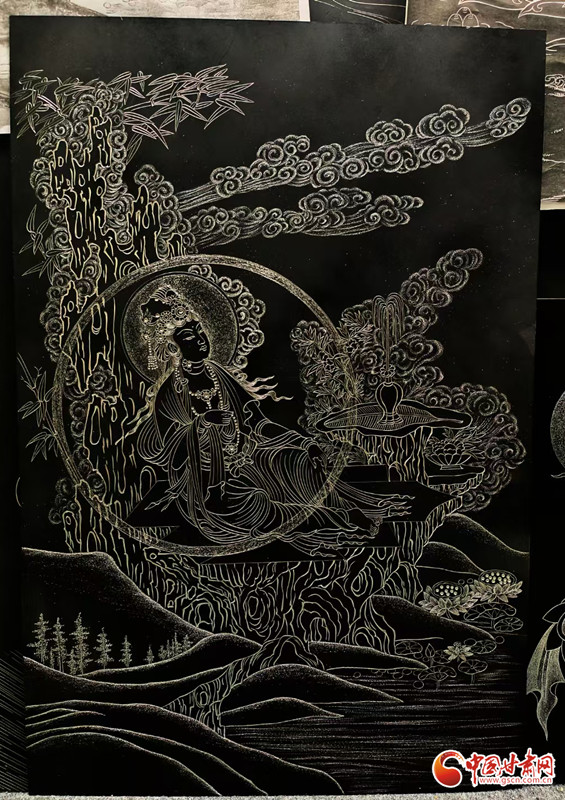 對張兆武來說,做鍥金畫從來不是“照貓畫虎”。他琢磨傳統(tǒng)書畫的筆墨、篆刻的力道,慢慢攢出了自己的一套刀法;創(chuàng)作時,心里裝的也全是敦煌——從莫高窟第112窟里“反彈琵琶”的靈動舞姿,到傳說中“九色神鹿”的溫潤模樣,都成了他刻刀下的主角。他刻出的飛天,飄帶像帶著風;刻出的菩薩,眉眼間透著莊重;金屬的光澤在畫面上流轉(zhuǎn),明明是靜態(tài)的畫,卻像在講一段活的敦煌故事。“不用多說什么,看過的人能懂這份美。”張兆武說的這份“懂”,恰恰打破了文化和語言的距離,讓東方的古老美學,和全世界的現(xiàn)代審美碰出了共鳴。