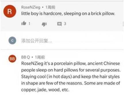 RoseNZieg留言:“這是個(gè)硬核男孩兒,睡在石頭枕頭上。”BBQ回復(fù)樓主:“這個(gè)枕頭是瓷器,中國古人都睡在這種硬枕頭上,還有一些是銅、玉、木頭做的。睡這種枕頭,不冬暖,但夏涼,還能保持飄逸的發(fā)型”