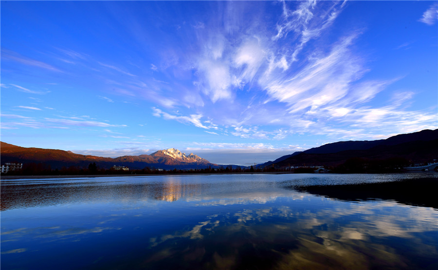 我是被亮光驚醒的。我和很多水從象山腳下的黑龍?zhí)睹俺鰜?。咕咚一聲翻上水面??匆姾芏嗖煌拥娜恕:陬^發(fā)的人,黃頭發(fā)的人。黑眼睛的人,藍(lán)眼睛的人。我看見了潭邊的亭臺樓閣。看見了花與樹。我還順著人們遠(yuǎn)眺的目光看見了玉龍雪山,晶瑩奪目矗立在藍(lán)天下面。潭水映照雪山,真讓人目眩神迷啊。人們在橋上,在堤上,說著不同的語言。在不同的語言里,都有那個(gè)詞頻頻出現(xiàn):麗江,麗江。這時(shí)的麗江已經(jīng)是一座很大的城了。城里也不是只有最初筑城的納西人了。如今全中國全世界的人都要來麗江,看納西古城的四方街,看玉龍雪山。