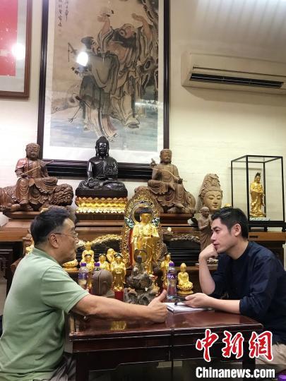 圖為葛亮(右)采訪澳門木雕佛像非遺傳承人 人民文學出版社供圖