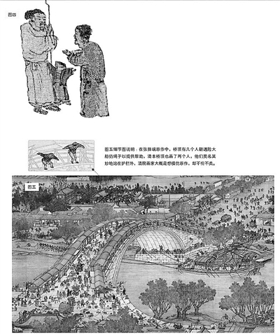 《清明上河圖》在后世有兩種重要的仿本,一個是明代仇英款仿本,一個是清院本。在本文結(jié)束之前,我要以清院本中的虹橋為例,來說明仿本與張擇端原作的一個重要差別。請看圖五,那就是清院本中的虹橋,那橋梁雄偉壯大,氣勢如虹,是吧?再看船與橋的關系,船很大,但桅桿早就放下來,完全可以順利通過。再看那些人物,他們小小的,就像螞蟻。他們像螞蟻,不是因為我們把圖縮得小,實際上,即使放大,也無法看出他們的個性、情緒,換句話說,這些人與其說是人,不如說是一些符號。把人符號化與賦予人物個性,這是仿本與原作的極大區(qū)別,也是我極力推崇原作的原因所在。《清明上河圖》,我們就看到這里。(文并供圖/田玉彬)