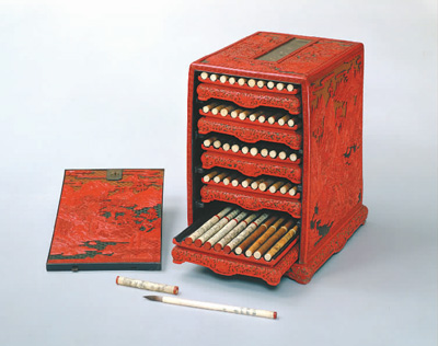 令人稱絕的還有乾隆御用的紫檀木旅行文具箱。這是一套箱裝形式的組合文具,按動機關(guān)并將木箱整體翻轉(zhuǎn)過來,便會轉(zhuǎn)化為一張高40厘米的書桌。箱內(nèi)置有布滿層、格、槽的盛物盒,用于盛放各種文房器物,包括琺瑯、漆器、玉器、瓷器等工藝精品,可謂一個移動的書房。
