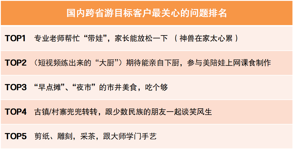 通過針對(duì)中青旅遨游網(wǎng)會(huì)員、中青旅聯(lián)盟成員單位的忠實(shí)客戶等群體的調(diào)研,以及近半年中青旅遨游網(wǎng)搜索、瀏覽的監(jiān)測(cè)數(shù)據(jù)進(jìn)行綜合分析。結(jié)果顯示,西南和西北是客戶喜好程度最高的兩大地域;云南、江蘇、新疆、三亞、陜西是客戶喜好程度最高的五大熱門目的地??蛻糇铌P(guān)心的問題,帶娃、參與、美食、閑逛、學(xué)藝則位列前五名。