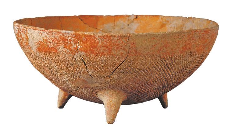 距今7800-7300年,這是只非常古樸粗糙的陶器,夾著細沙的紅陶,除了缽口內(nèi)外裝飾的紫紅色寬帶紋就沒有別的裝飾了,造型卻也獨特,在圓形鈸底有三只短短的足。若說此彩陶缽再沒別的裝飾,似不準確,有細心的人會發(fā)現(xiàn),缽身細密地布滿交叉網(wǎng)狀的繩紋。沒錯,這種繩紋是大地灣文化彩陶最為典型的特征,并不僅僅在這只彩陶缽上有,大地灣出土的其他彩陶上都有這個最具代表性的紋飾特征。但這種繩紋本就不是做裝飾用的,而是在制陶時壓印上這些繩紋使陶坯更加結(jié)實,另外,制成的缽?fù)氲忍掌饔辛诉@些繩紋可使得表面變得粗糙,人們可以捧得更牢,不容易失手摔碎。要知道,新石器時代早期生產(chǎn)力水平是多么的低下,遠古先民制這么一只彩陶器可是不容易呢。