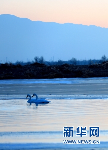 2022年1月2日,晨曦初露的甘肅省張掖市甘州區(qū)黑河流域,一群大天鵝在河中棲息、覓食,宛如一幅靜美的畫卷。新華網(wǎng)發(fā)(楊永偉 攝)