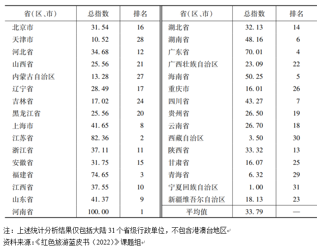近日,北京第二外國語學(xué)院旅游科學(xué)學(xué)院與社會科學(xué)文獻(xiàn)出版社共同發(fā)布了紅色旅游藍(lán)皮書《中國紅色旅游發(fā)展報告(2022)》(以下簡稱《藍(lán)皮書》)。《藍(lán)皮書》指出,中國紅色旅游發(fā)展水平持續(xù)提升,31個省級行政單位(不含港澳臺地區(qū))的紅色旅游發(fā)展指數(shù)排名中,位列前十的依次為河南省、江蘇省、福建省、廣東省、海南省、湖南省、四川省、上海市、山東省、江西省。