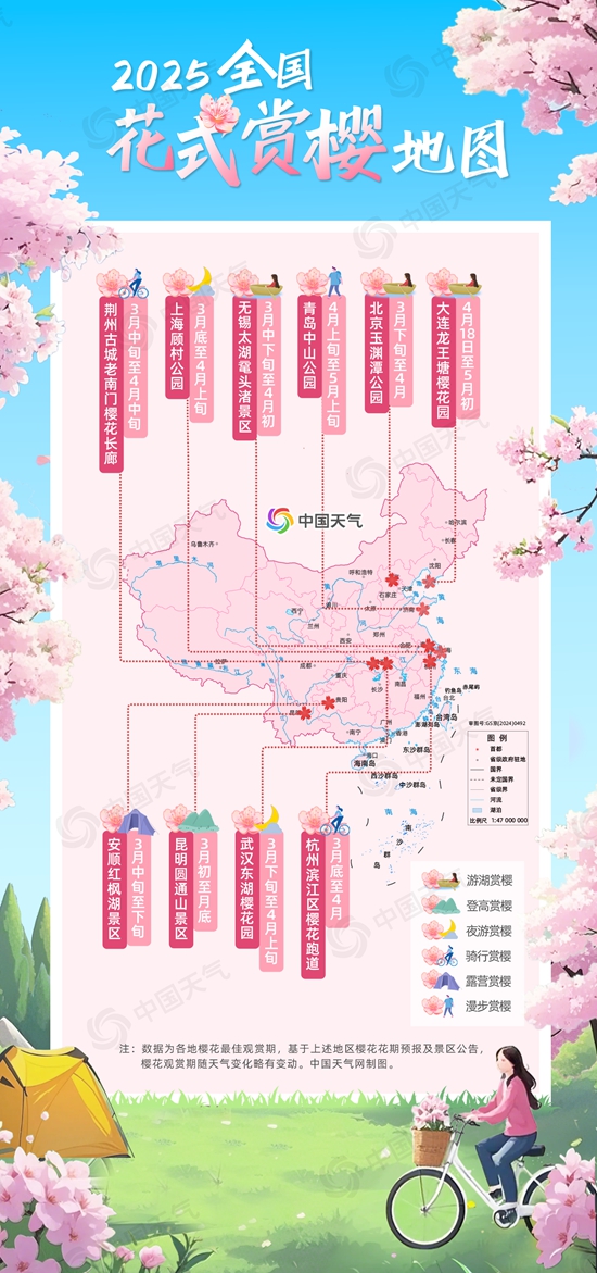 “櫻花紅陌上,柳葉綠池邊。”又是一年櫻花季!今年3月中下旬以來(lái),我國(guó)大部經(jīng)歷了大回暖,催動(dòng)春花盛放,目前武漢、南京等地櫻花已進(jìn)入盛花期,北方多地櫻花也開(kāi)始迎來(lái)觀賞期。中國(guó)天氣網(wǎng)特別推出2025全國(guó)花式賞櫻地圖,盤點(diǎn)十大賞櫻勝地最佳觀賞期和花式玩法,快來(lái)開(kāi)啟你的賞櫻之旅吧。