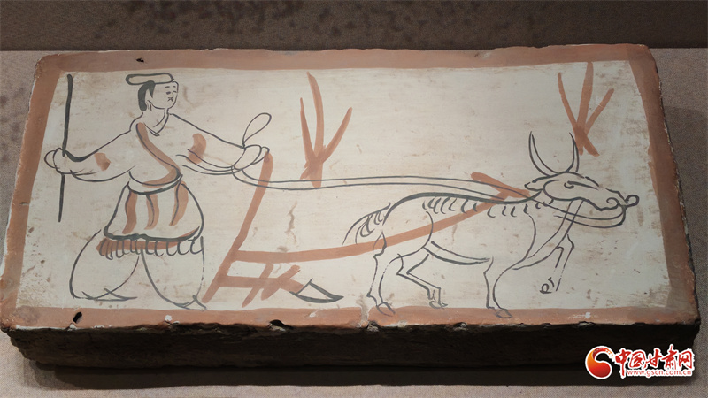 在博物館的“古冢丹青——高臺魏晉十六國時期墓葬壁畫藝術陳列”展廳里,記者看到,《二牛耕地畫像磚》生動再現(xiàn)了當時的農(nóng)耕技術:兩頭耕牛架著直轅犁,后隨的男子一手扶犁一手揚鞭,展現(xiàn)了典型的“二牛抬杠”耕作方式?!赌谅箞D壁畫磚》則描繪了古人放牧鹿群的獨特場景,為研究當時的畜牧業(yè)發(fā)展提供了珍貴資料。