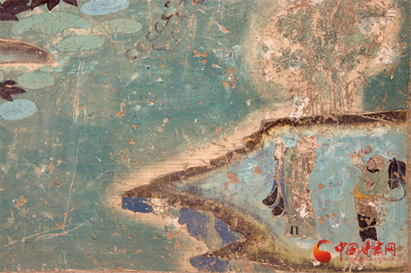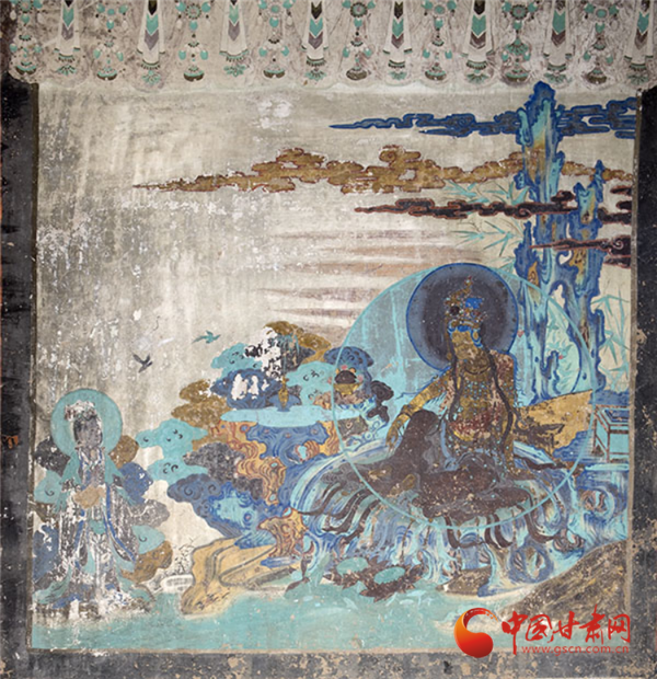 兩幅作品均以青綠色調(diào)為主,觀音面部貼金雖已氧化,卻仍顯清新淡雅,更以“馬一角、夏半邊”的構(gòu)圖巧思,用對(duì)角線分割畫(huà)面、大量留白,讓有限的壁面生出無(wú)窮空間感,堪稱(chēng)中國(guó)傳統(tǒng)美學(xué)與佛教哲理的完美融合——正如唐代白居易贊水月觀音“凈淥水上,虛白光中”,這般意境在榆林窟的壁畫(huà)里被演繹得淋漓盡致。