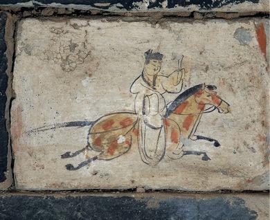 它的“不一般”,首先在于其“極簡(jiǎn)卻傳神”的藝術(shù)風(fēng)格。該磚的畫面以赭石色為底,墨線寥寥,卻生動(dòng)勾勒出一位策馬疾馳的驛使:頭戴魏晉幘帽,身著右衽短衫,左手控韁,右手舉著文書。而駿馬則四蹄騰空,動(dòng)態(tài)感十足,一種風(fēng)馳電掣的緊迫感似從畫中撲面而來。更耐人尋味的是,畫師刻意省略了驛使的嘴巴:這一“殘缺”設(shè)計(jì),并非疏忽,而是古人智慧的體現(xiàn),象征著郵驛制度中“守口如瓶”的保密原則,使其成為中國(guó)古代信息保密文化的生動(dòng)見證。